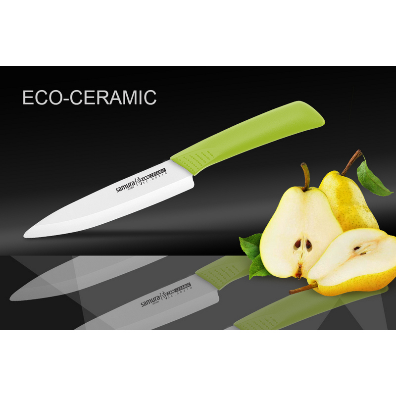 SAMURA ECO CERAMIC - это бесценные помощники на кухне! Керамические ножи - надежный инструмент для работы с овощами, фруктами, хлебом, грибами, мясным и рыбным филе, мясными деликатесами. Лезвие изготовлено из циркониевой керамики. Используемое для изготовления лезвия сырье закаливают при температуре 1500 градусов Цельсия в специальных печах, для достижения особой прочности и защиты керамики от трещин и изломов. Колоссальная острота и износостойкость режущей кромки ножей, благодаря сверхвысокой твердости. Оксид циркония занимает третье место по прочности, после алмаза и корунда! Идеально долго держит заточку! Керамический нож благодаря сверхвысокой твердости способен резать без заточки годами, на нем не появляются царапины, он не ржавеет, и при этом он ощутимо легче стального. Керамика не оставляет неприятного послевкусия, потому что не вступает в химическую реакцию ни с какими продуктами и не впитывают запах продуктов - например, рыбы. Продукты при нарезке не прилипают к лезвию. Эргономичная рукоять из ABS-пластика, покрытого термостойким каучуком, предотвращает выскальзывание ножа. Керамические ножи идеальны для приготовления пищи всем любителям здорового питания!
